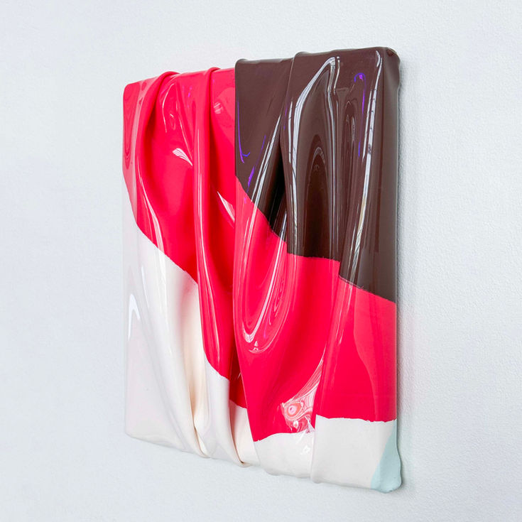Colour and form work together closely within Steyaert’s work, guiding the viewer’s eye along the undulations of her chosen material. Making use of a wide variety of colours, often melding them together to create near-psychedelic patterns across the surface of the silicone, Steyaert’s work is simultaneously simple and meditative. In recent works, Steyaert has made us of metallic pigments, which flash and glare as the silicone is manipulated across the stretchers, interrupting the viewer’s gaze and drawing further attention to the uniqueness of both the colours used and material surface itself.