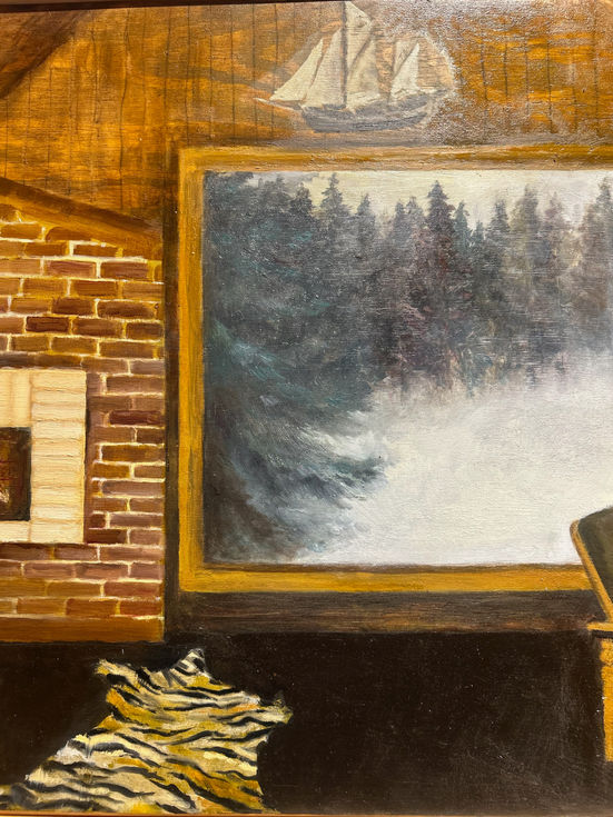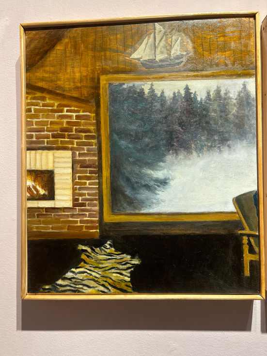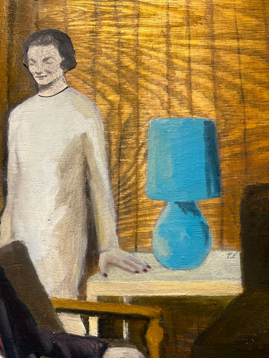 This pieces is two paintings, a diptyk made to place next to eachother. Through collage and mixed media, she creates images that depict people and places in a moment. The materials are adapted to the motifs, and she uses oil, pastel, acrylic and watercolour.